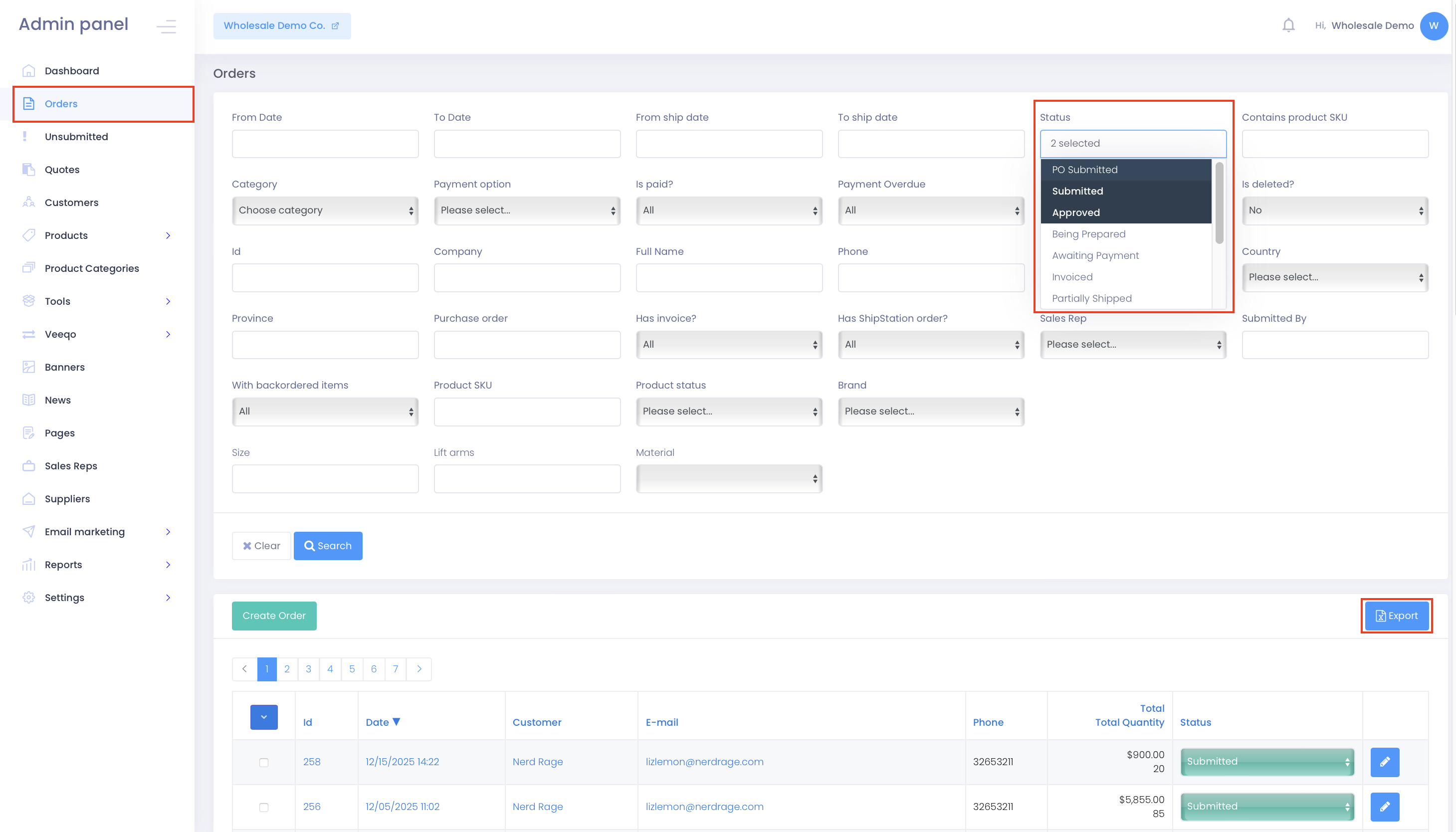 To export orders placed on your digital B2B store, go to the Orders menu on your Admin Panel and click the “Export” button.