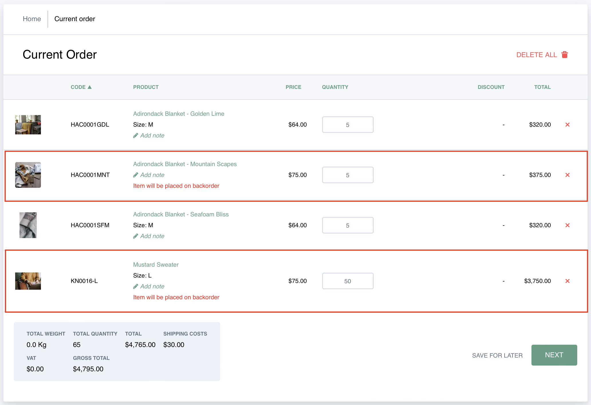 When a customer places an order that contains items on backorder, B2B Wave automatically splits the order based on product availability.