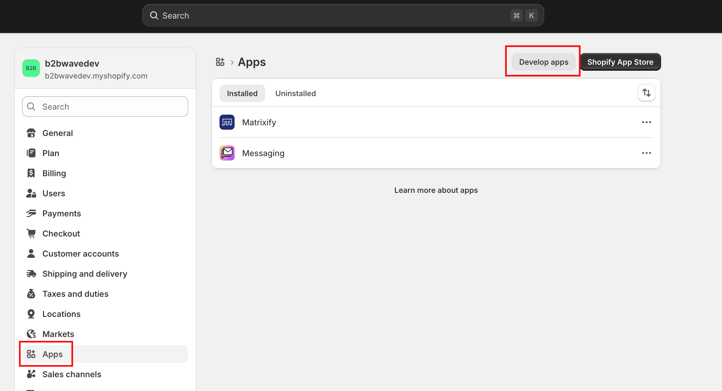 Step 1. Log in to your Shopify account and go to “Apps” on the sidebar menu, then click “Develop apps”.
