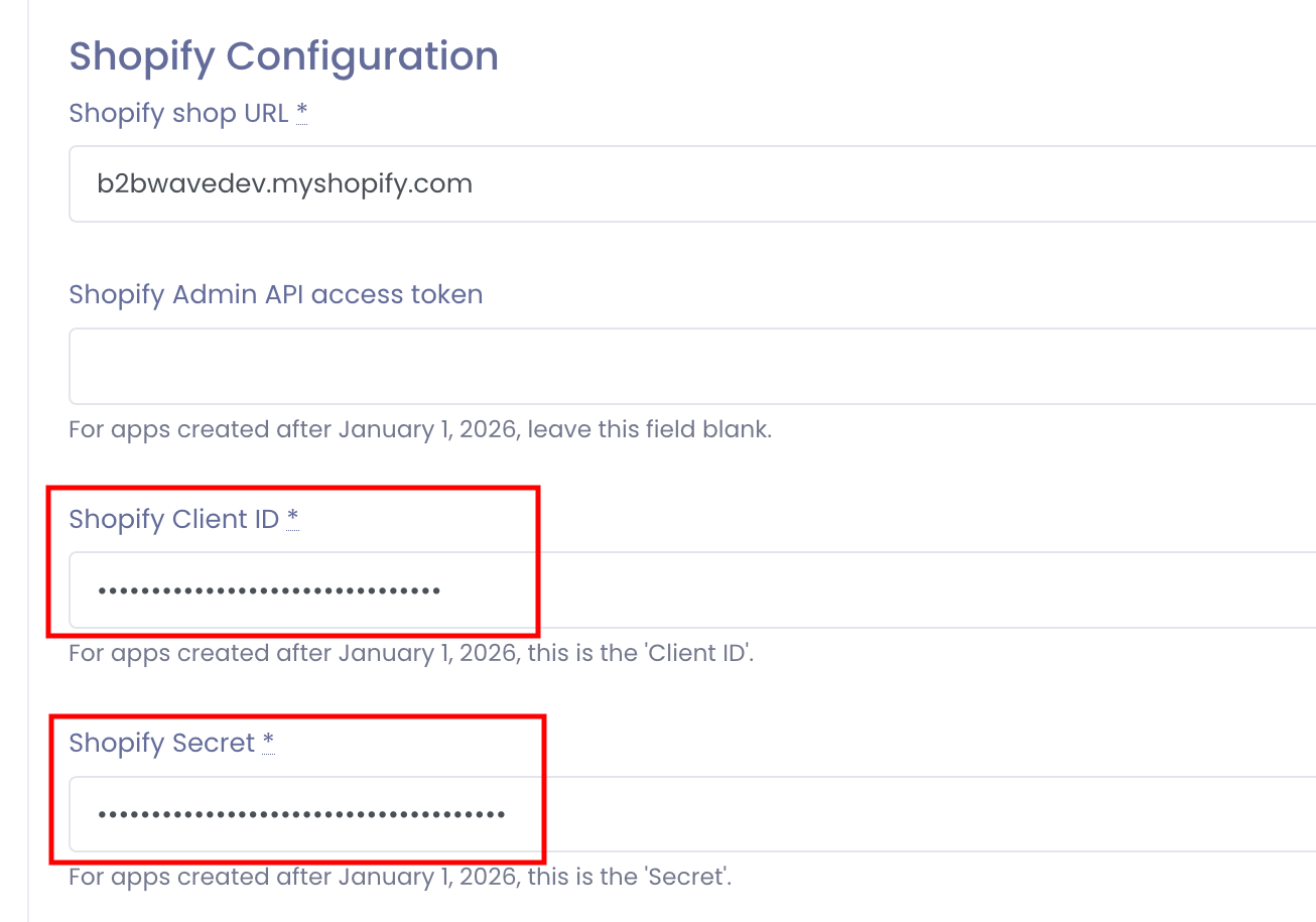 Step 2. Copy the “Client ID” and “Secret” fields from Shopify to the corresponding “Shopify Client ID” and “Shopify Secret” fields on B2B Wave.