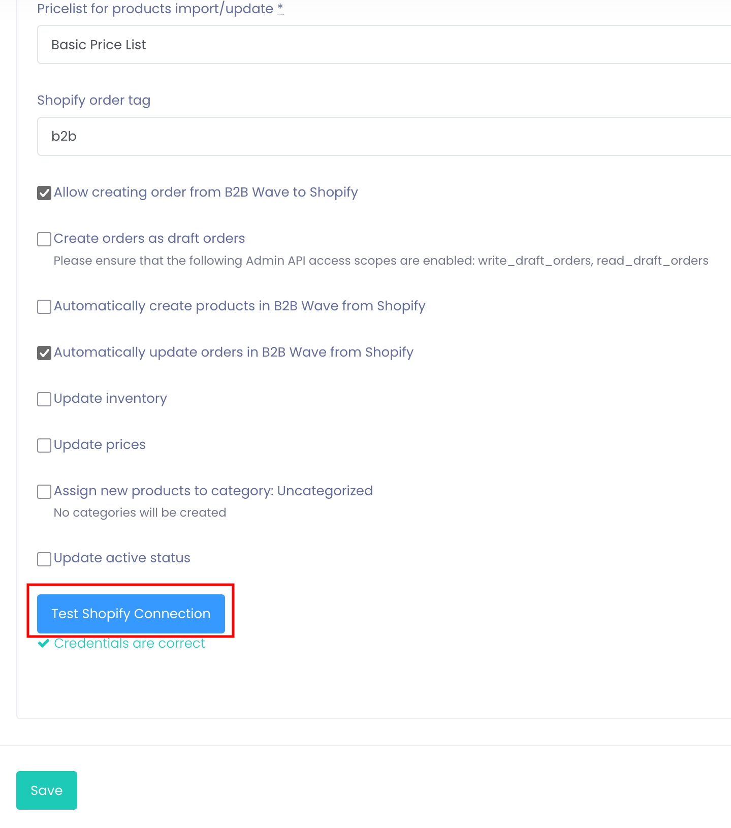 Step 3. Click “Test Shopify” to confirm that all credentials are correct and connect your Shopify store to your B2B Wave account.