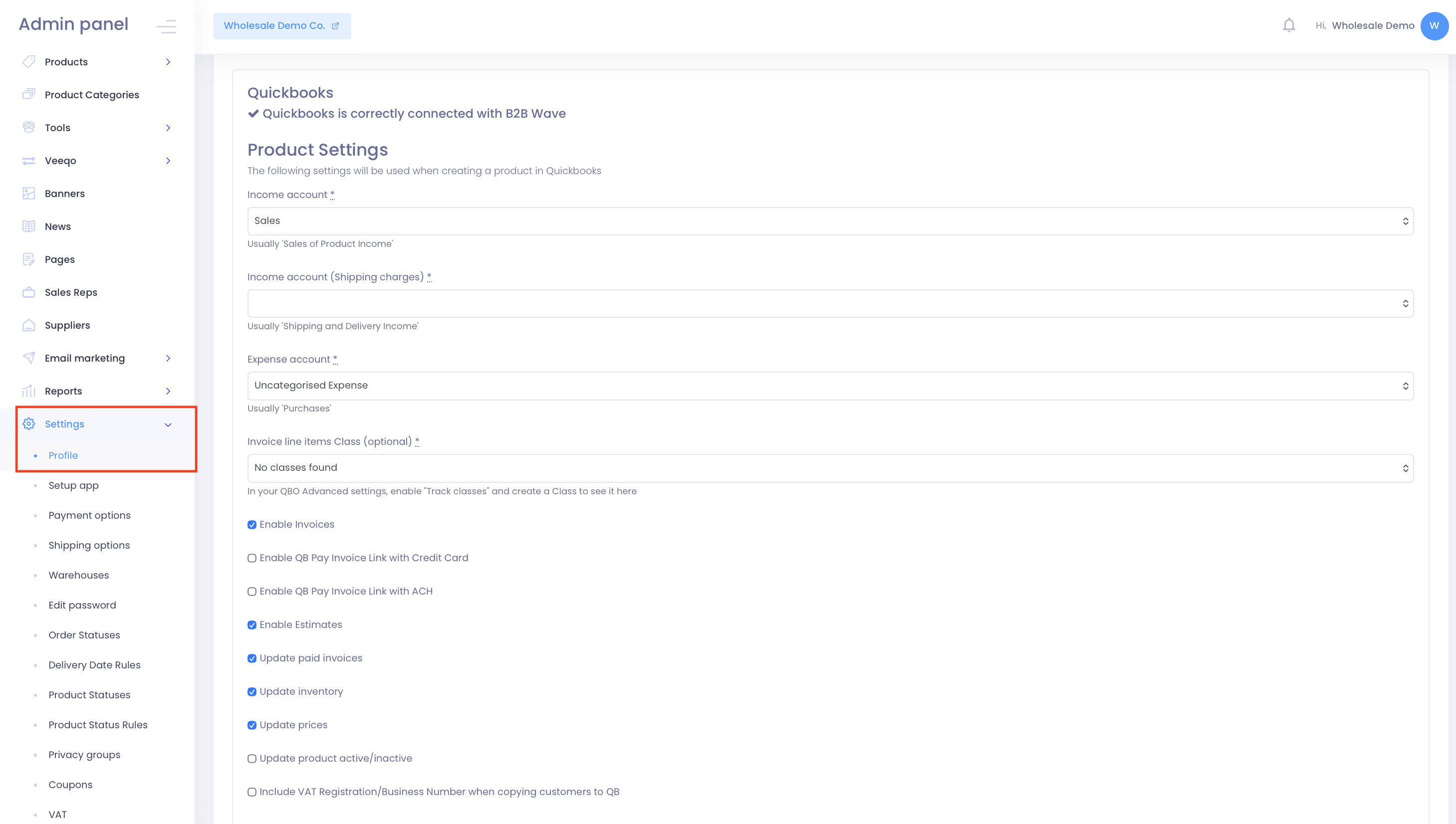 Through the QuickBooks Online integration (QBO), you can create invoices from within your B2B Wave account. You can also sync order, customer, and product data, and many more. Let’s see how you can set up the integration on your B2B Wave eCommerce platform.